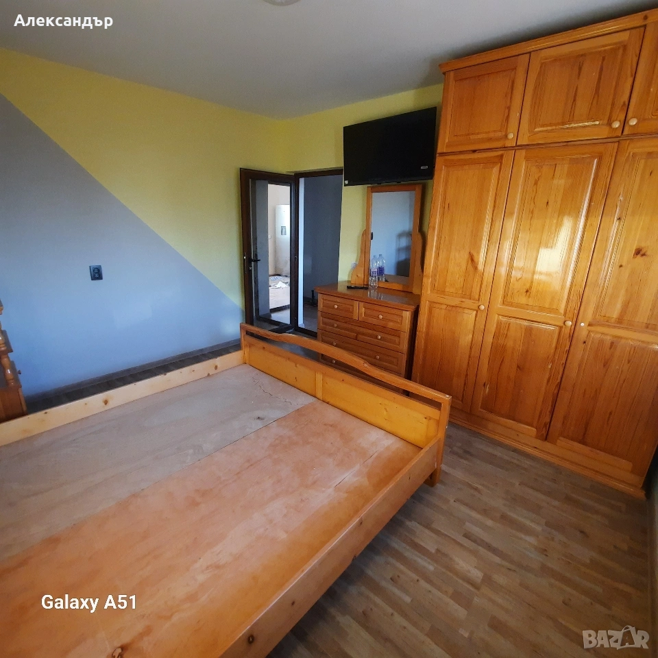 къща близнак с обща площ от 223кв.м. Етажите са със самостоятелен вход и самостоятелно вътрешно стълбище, малко мазе 4,5кв.м. Половината от приземният етаж 40кв.м. след основен ремонт. Състоящ се от коридор,килер, спалня, кухня, баня с тоалетна, без преходни стаи. Етажът е напълно обзаведен с вътрешна топлоизолация, 2бр. хиперинверторни климатици и с всички електроуреди необходими за едно домакинство. Малка междуетажна тераса 3кв.м.. Вторият етаж 96кв.м. , без преходни стаи е състоящ от коридор, три спални, кухня, баня с тоалетна и две тераси. Етажът е след основен ремонт, вътрешна топлоизолация, банята е напълно завършена и обзаведена,както и двете тераси. Кухнята и коридора са с подови настилки теракот. Спалните са с ламинат, стени и тавани с антибактериален латекс. Част от мебелите и електроуредите са вече налични. Цялото подпокривно пространство като тавански етаж. Еднопространствено помещение, прекарана ел. и ВИК инсталация. Нуждае се от основен ремонт. Покривът е ремонтиран преди 3години. (Напълно сменени ел. и ВИК инсталации на входа и всички етажи, напълно сменена дограма и интериорни врати, като дограмата на приземния, втория етаж и входа са най-висок клас, а на тавансия етаж е напълно сменена, но с по-евтин вариант, само входната врата не е сменена. Къщата може да се ползва от едно, две или три семейства, като 3 апартамента)