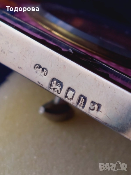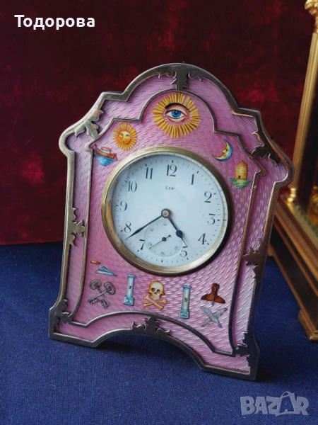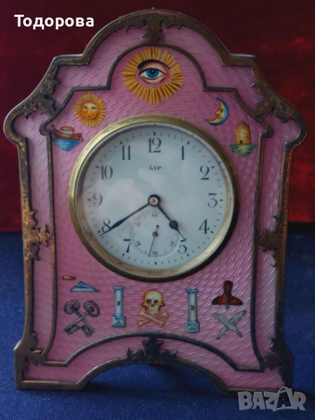-репетир. Бие на половин и на всеки час.С едно навиване работи две седмици-14 дни,безотказно и много точно.С репетира може принудително да го накарате да ви покаже с гонг колко е часът.състиянието му е като неизползван,посребрен циферблат,бронзовата каса е с прекрасни колони с гръцки орнаменти, с 22 каратова позлата..Размерът му е най големият за каретните часовници.Много звучен гонг.Цена 4200 лева. Предлагам за продажба този прекрасен сребърен часовник.Изработен в Лондон през 1924 година.Ювелирната работа се състои от сребро и поставен емайл(гилеше) и изрисувани масонски и темплиерски символи.Мога спокойно да го нарека уникат.Естествено,че има подобни,но с такива символи не съм срещал.Цена-5000 евро.