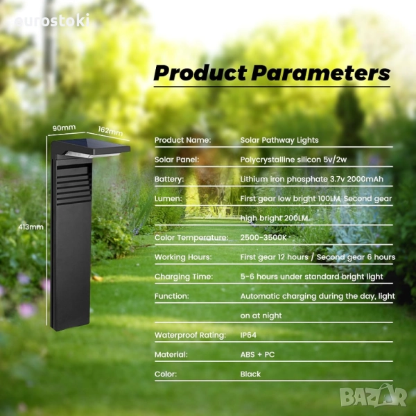 Две регулируеми нива на яркост: ниска яркост/100 lm, висока яркост/200 lm. Соларна лампа за пътека се зарежда за 5-6 часа при стандартна яркост, ниска яркост/12 часа, висока яркост/6 часа. Метод на настройка: бутон 1 "включено, ниска яркост", бутон 2 "висока яркост", бутон 3 "изключено". (През зимата яркостта и продължителността на соларните лампи може да варират през нощта поради различната интензивност на светлината през деня).