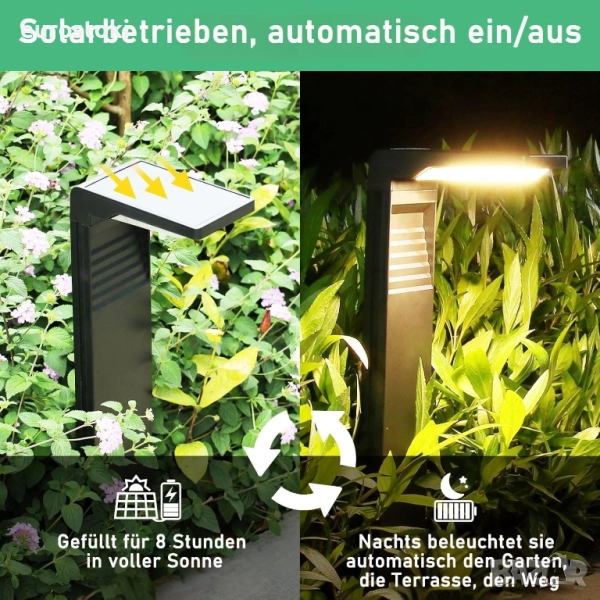 Автоматично включване/изключване: слънчевите градински лампи, когато е тъмно, лесно откриват промени в яркостта на открито, включват се автоматично през нощта и се изключват автоматично при изгрев слънце. Забележка: LED слънчевите градински лампи, когато използвате за първи път, превключвателят за външно осветление трябва да се включи ръчно, за да се превключи в състояние "ВКЛ.".