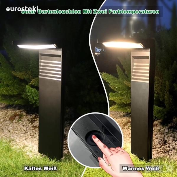 Лесен монтаж, без окабеляване. Просто извадете от опаковката, сглобете, поставете колчето в земята, заредете напълно и след това плъзнете превключвателя в положение ON.
