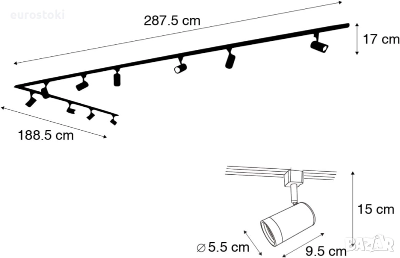 Общата релса е с дължина 476 см и височина 17 см, включително прожекторите. Можете да допълните този комплект с десет източника на светлина GU10. Уверете се, че ги поръчвате отделно, източниците на светлина не са включени. Тези прожектори са димируеми и с външен димер (димерът не е включен). С тази еднофазна релсова система всички лампи се управляват заедно чрез един димер или стенен ключ. Това означава, че всички лампи се димират или включват/изключват едновременно.