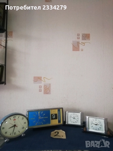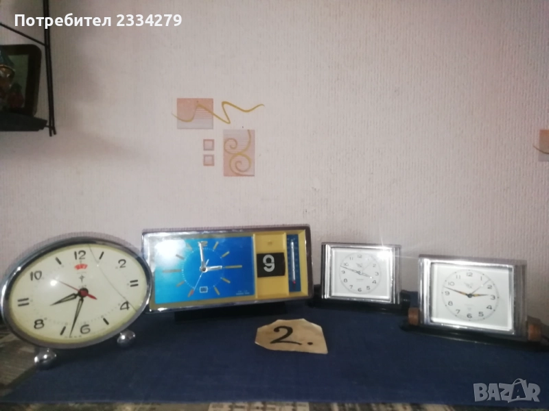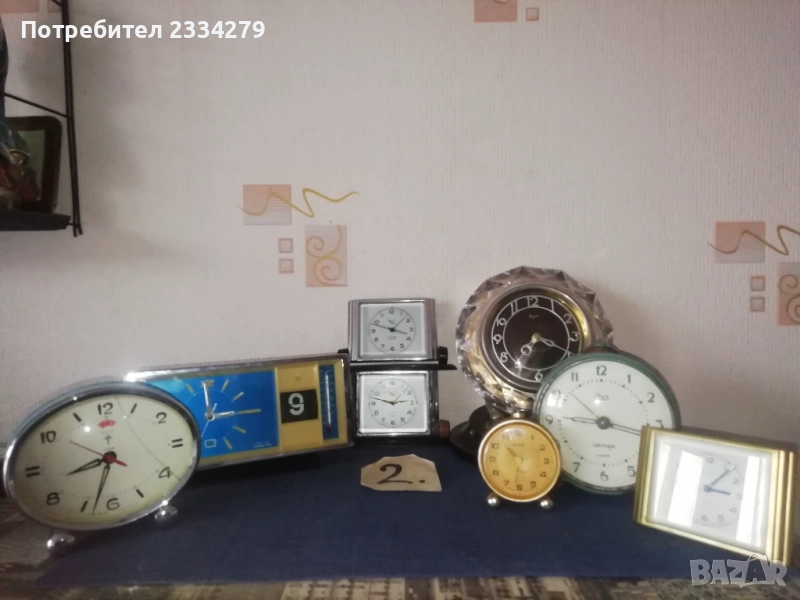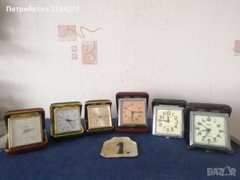 Стари часовници будилници от различни години и различни модели и държави. ТУРИСТИЧЕСКИ-ПЪТНИЧЕСКИ часовници будилници, от ляво на дясно N:1 часовник ,,EUROPA" 2 камъка, супер състояние, цена 10€.; N:2 ,, JUNGHANS" W.Germany, перфектен, цена 15€.; N:3 ,,DIAМANT" 7камъка,отлично състояние, цена 11€.; N:4 ,, ДОРОЖНЬIЙ" 11камъка сделано в СССР, цена 13€.; N:5-6 часовници ,,СЛАВА" 11камъка (имат забележки калъфките липси) 10€. за двата. Другите домашни будилници от ляво на дясно, N:1 ,,DIAMANT POLARIS" в много добро състояние но с пукнато стъкло, цена 7€.; N:2 ,,DIAMANT-SHANGHAI" 1970-80год. в много добро състояние има часовник, датник, будилник и термометър, цена 17€.; N:3 два БРОЯ ,,ПИОНЕР" сделано в СССР през 70год., 11камъка, 8€. за брой ; N:4 ,,Majak" кристален, сделано в СССР през 80-те години, цена 21€.; N:5 ,,SLAVA" сделано СССР, цена 4€.; N:5 ,,OЧЗ ЯНТАРЬ" 4 камъка СССР 1950-60те години, работи но понякога спира (трябва да мине профилактика, да се почисти) цена 8€.