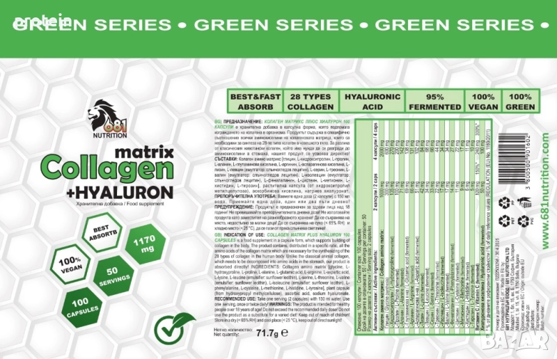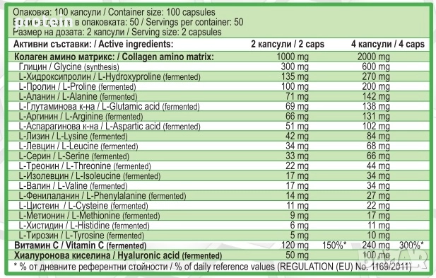 Продуктът съдържа в специфично съотношение всички аминокиселини на колагеновата матрица, които са необходими за синтеза на 28-те типа колаген в човешкото тяло. За разлика от класическия животински колаген, който има нужда да се разгради до аминокиселини в стомаха, нашия продукт се усвоява директно!