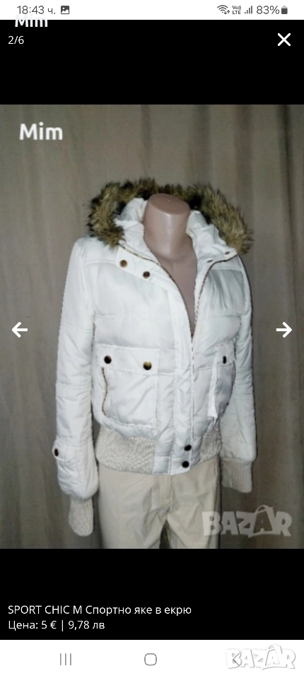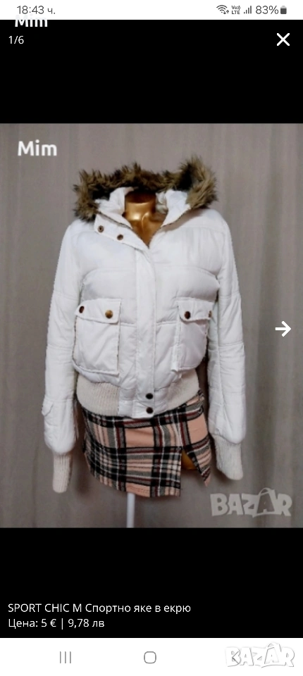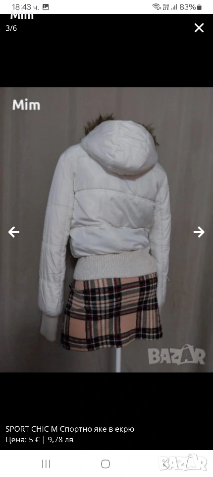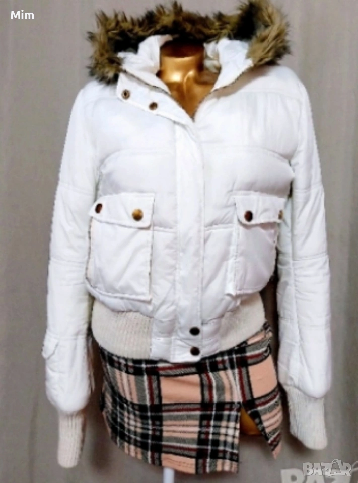 Спортно къса яке с качулка ,на ръкавите и отдолу е с плетен стегнат с брокатена,нишка,ластик ,закопчаването е отпред с цип и копчета тик так с външни джобове с цип гръдна 100 см ,надолу се спуска свободно, дължина 55 см ,дължина на ръкавите 67 см Няма забележки.
