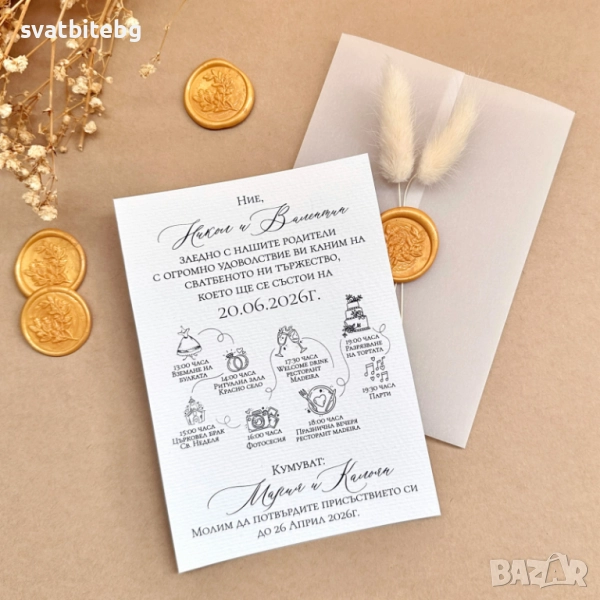 Сватбени покани с восъчен печат, покани в плик, покани с програма → Обява 52033445