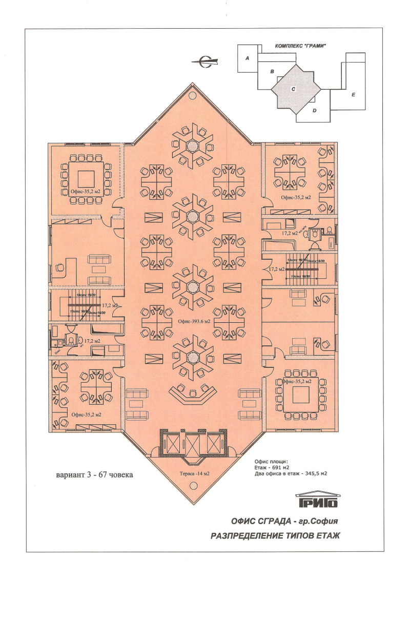 ГРИГО-Х ЕООД собственик на БИЗНЕС ЦЕНТЪР 'ГРАМИ' и отдава под наем Офис площи. Свободни са етажи 1, 2, 3, като площта на един офисен етаж е 645кв.м. /740кв.м. с ид.части. Наемната цена за етажи 1,2 и 3 е в размер на 7,00евро/кв.м.без ДДС, отделно от наемната цена се заплаща Такса поддръжка в размер на 1,60евро/кв.м. без ДДС. Разпределение на етаж: Open space зала, 4 кабинета , санитарни помещения мъже/жени по две на етаж. Възможност за обособяване и на кухненски бокс със зала за хранене. Светла височина на етаж 2,70м. Сградата е с три асансьора, етажна VRV климатична система / отопление-охлаждане/, BMS система - ежедневната поддръжка на сградната и инженерните системи, I-ва категория електрозахранване осигуряващо непрекъснатост на захранването като сградата е свързана с две независими електроподстанции.