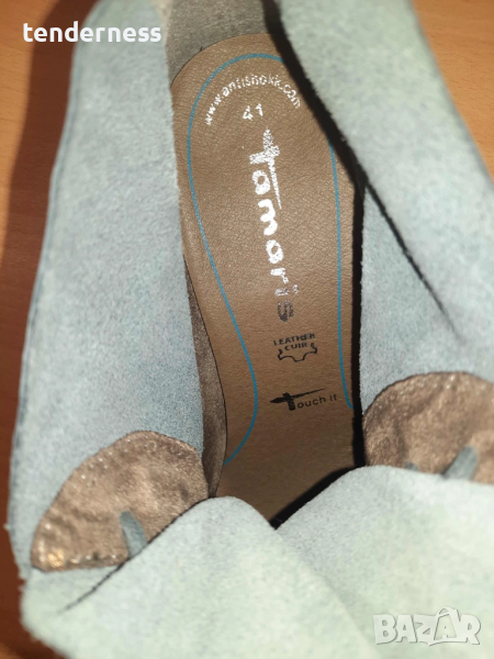 Прекрасни боти от естествена кожа на Tamaris. Цвят - светло синьо-сиво. Размер 7, което отговаря на 40-41. Стелка 26 см, ток - 4 см.