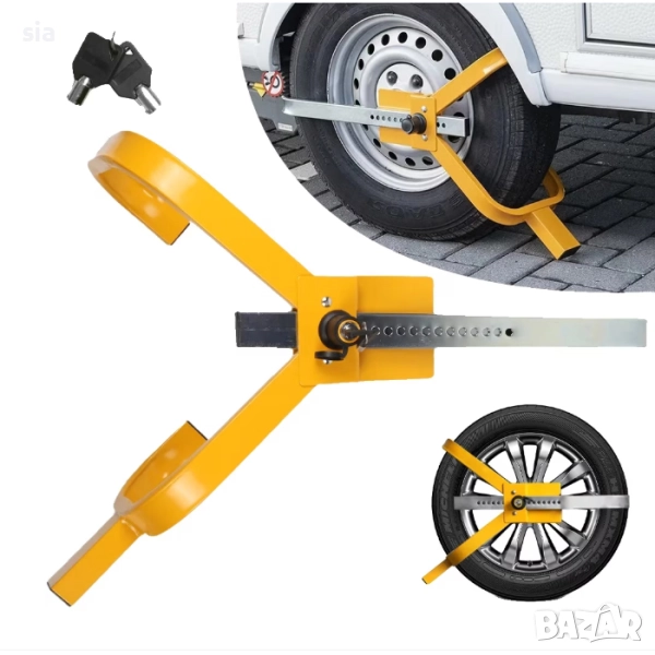 Надеждна метална скоба за заключване на автомобилни гуми, предназначена за предотвратяване на кражба или неоторизирано преместване на превозното средство. Изработена е от здрава стомана с устойчиво на атмосферни влияния покритие в жълт цвят за по-добра видимост.