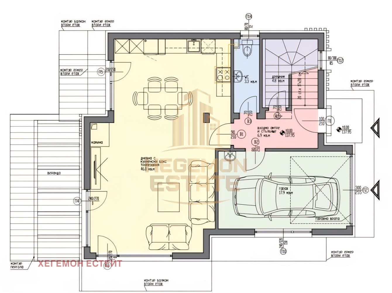 Първи етаж (95,4 кв.м.) включва просторен дневен тракт с кухненски кът (46 кв.м.), веранда, тоалетна, килер, входно антре, стълбищна клетка и гараж (18 кв.м.).