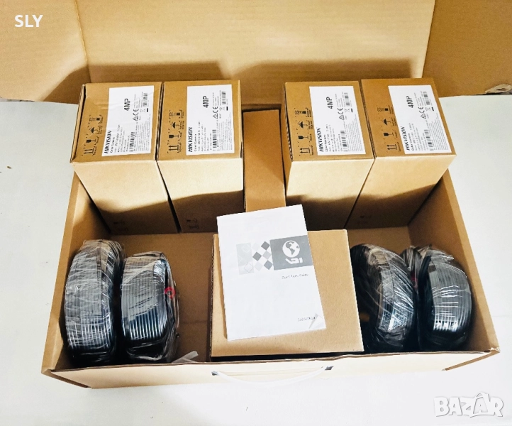 Съдържа 4 броя камери , 4 броя захранващи кабели , 1 брой DVR с хардиск 1TB , захранващ кабел за DVR и мишка.