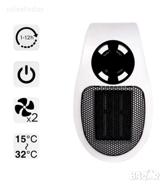 400W вентилаторна печка с дистанционно управление и функция таймер (1-12 часа), автоматично изключване, 2 скорости и регулируема температура. Включва дистанционно управление (4x10,3 см) и изисква 2 батерии AAA (не са включени). Включва инструкции.