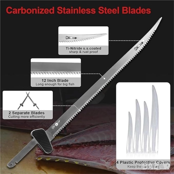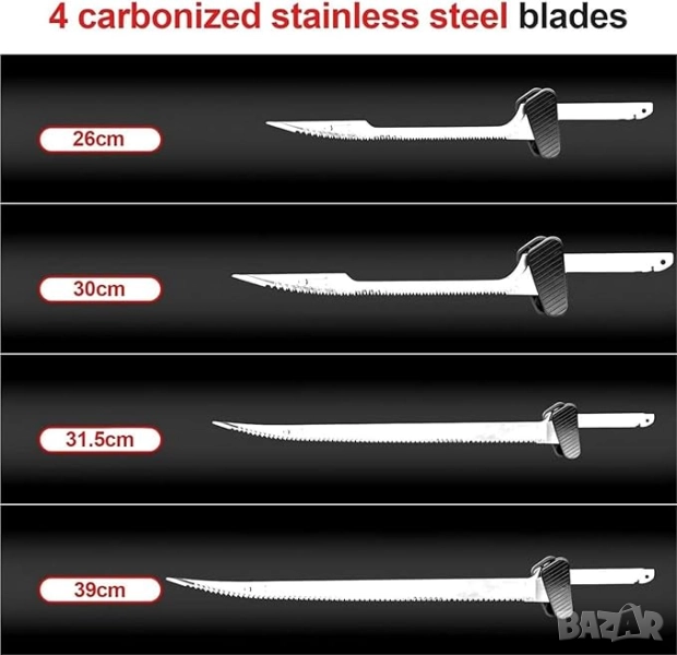 Електрическият нож за риболов се предлага с 4 различни размера резервни ножове. Остриета 26 см, 30 см, 31,5 см и 39 см. Острието е изработено от неръждаема стомана със слой от титанов карбид. Има много видове остриета, от които да избирате в зависимост от размера и вида на рибата.