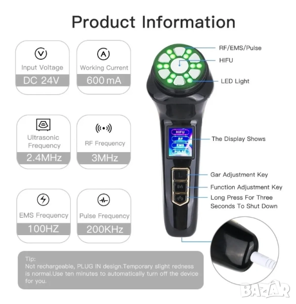 LED светлината е съчетана с всяка функция и не може да се използва самостоятелно. Всеки цвят е подбран според ефекта на съответния режим, като засилва резултатите чрез фотобиомодулация.