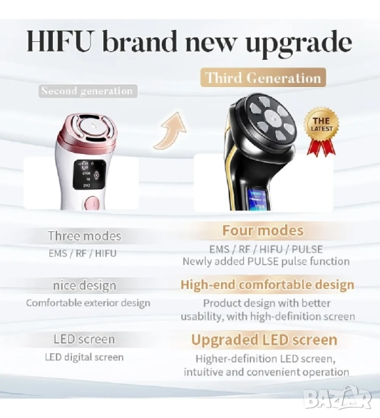 Уред от ново поколение, съчетаващ HiFu, RF, EMS, мезопорация и LED терапия за дълбоко въздействие върху кожата и мускулната структура. Подходящ за лице, шия, деколте и тяло.