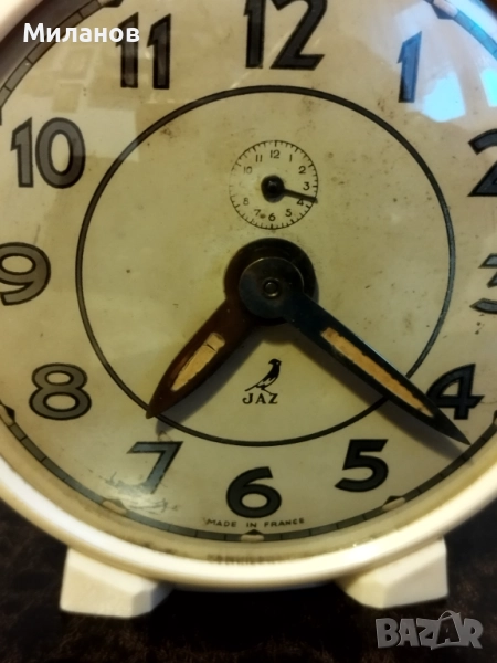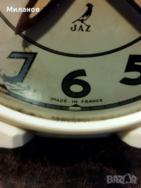 Стар френски механичен будилник Jaz.Отремонтиран и смазан, работи и звъни.Голям е, диаметър-134 милиметра.Номер на часовника-107694
