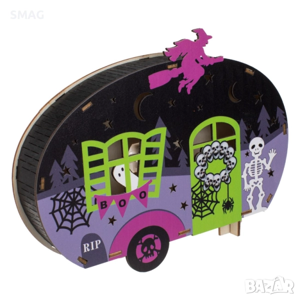 Дървена Halloween / Хелоуин декорация с форма на каравана, украсена със скелет, вещица, призрак и паяци. Разполага с две LED светлини и бутон On/Off за ефектно осветяване. Идеална за създаване на празнична атмосфера у дома.