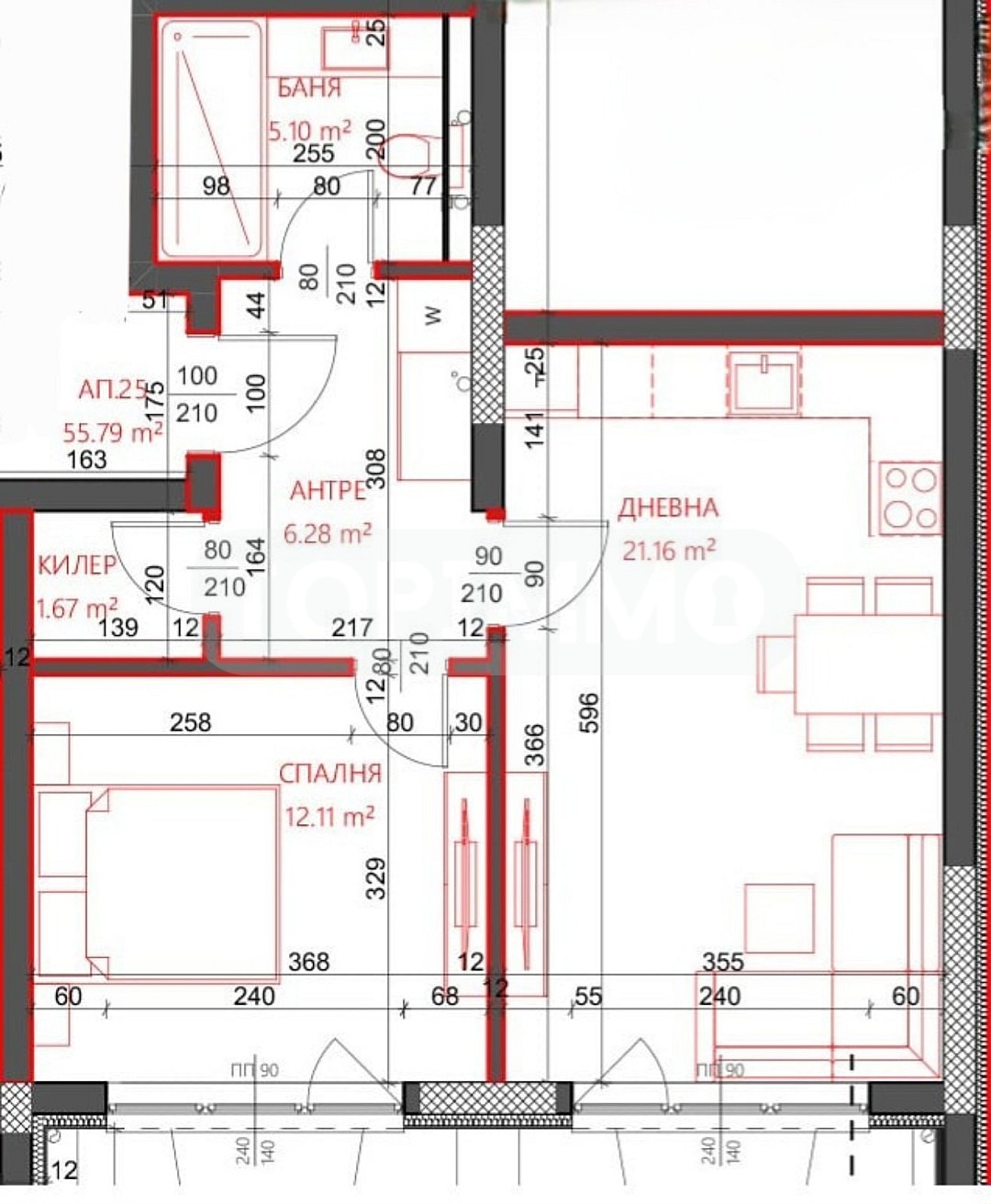 Апартаментът е разположен на първи партерен етаж с изцяло южно изложение и следното разпределение: антре с килер, всекидневна с кухн. част 21.16 кв.м., спалня 12.11 кв.м., санитарен възел.