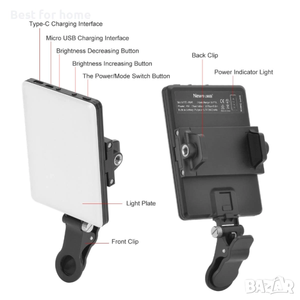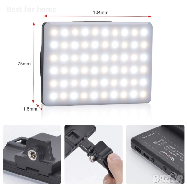 LED видео лампа Newmowa, 3200-5600K, 3 режима на осветление и яркост, 10 нива на димиране, CRI95+, ултратънка панелна лампа с щипка за телефон, вградени акумулаторни батерии за телефон, iPhone, Android, iPad, лаптоп.