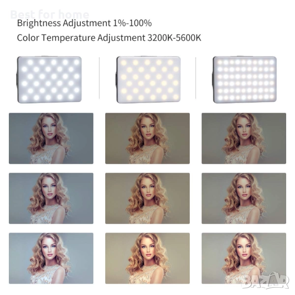 Има висока яркост, естествени и меки светлини, можете лесно да контролирате яркостта (10 нива на яркост) и 3-те режима на светлина (бяло, топло бяло и топло жълто) от 3200K до 5600K. Можете да регулирате режимите и яркостта според вашите изисквания, за да отговорите на всички ваши нужди при различни обстоятелства.