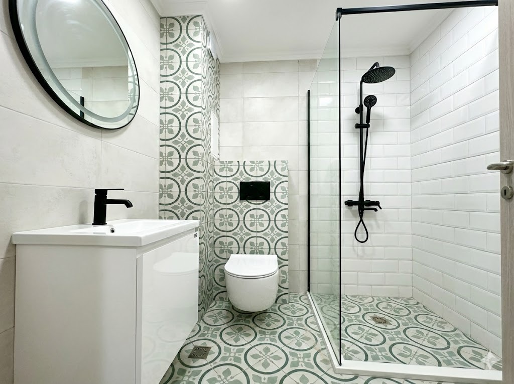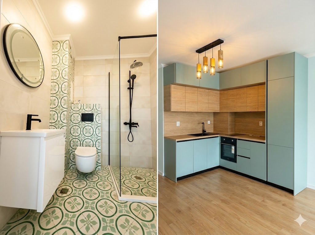 Апартаментът се предлага напълно завършен, с висок клас материали и стилни дизайнерски решения. Кухненският бокс е изпълнен с модерни шкафове и вградени уреди, в комбинация от топли дървесни и пастелни тонове, създаващи усещане за уют и изисканост. Банята е завършена с качествени декоративни плочки, душ зона със стъклена преграда и черни дизайнерски смесители, които придават характер и стил.