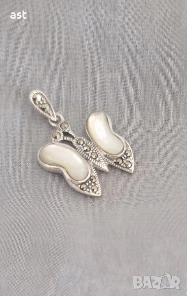Сребърен медальон пеперуда със седеф и марказит, сребро проба 925, 4,5 гр.