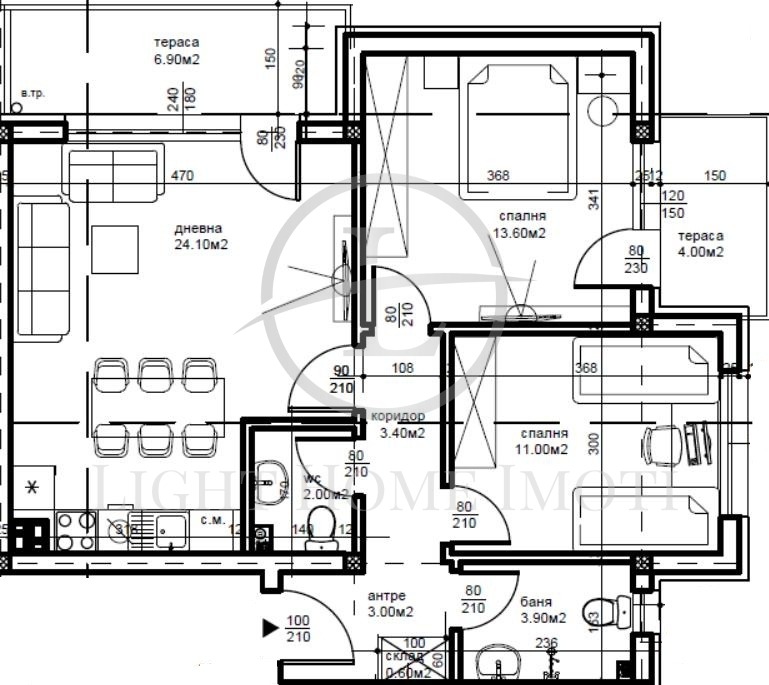 -Разпределение- просторен хол с кухненски бокс, две спални, баня с тоалетна, тоалетна, склад, входно антре и две тераси.