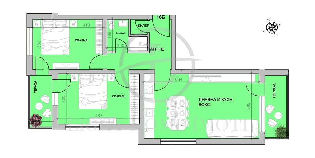 -Разпределение- Просторен хол с кухненски бокс, две непреходни спални, баня с тоалетна, килер, входно антре и две тераси.