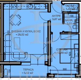 - Разпределение: Голям хол с кухненски бокс, просторна спалня, баня с тоалетна, входно антре , тераса и склад