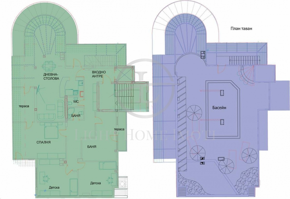 - Разпределение: Първо ниво: Просторен и светъл хол с прекрасна гледка, кухненски бокс и трапезна част, три спални, голяма баня с тоалетна, входно антре и голяма тераса. Второ ниво: Градина, барбекю , басейн и панорамна гледка към целия град.