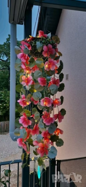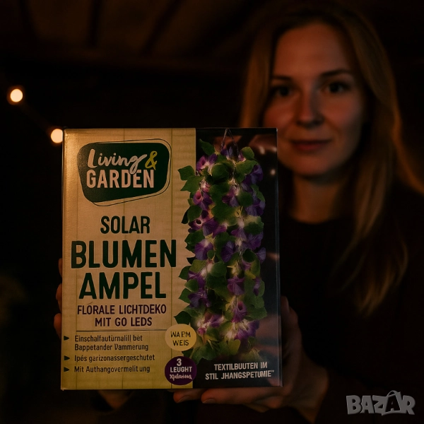 Добавете очарование и уют към вашата градина, тераса или балкон със соларната висяща саксия Living & Garden. Това е декоративно осветление с флорален дизайн и вградени 60 LED светлини, които създават мека и приятна топла бяла светлина. Напълно автономна и лесна за използване, тя се захранва от слънчева енергия и се включва автоматично при здрач.