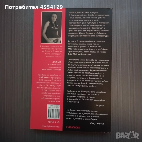 ИРИНА ДЕНЕЖКИНА е родена в Екатерининбург. Следва журналистика. Пише разкази за себе си и ги дава на приятели да ги четат, а те й препоръчват да ги публикува в Интернет. Произведенията й са номинирани за наградата “Национален бестселър” и дори без да са във вид на книга, стигат до финала. Ирина веднага е обявена за надежда на съвременната литература. Правата за издаване на сборника са продадени в 20 страни. В Италия Денежкина със седмици е в топ 10, наред Паулу Коелю и Исабел Алиенде. В САЩ разказите й успяват да пробият недоверието към съвременната руска литература.