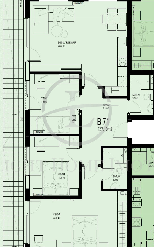 - Разпределение: Просторен и светъл хол с кухненски бокс 34кв.м, три спални ( едната 22,30 кв.м,със собствен санитарен възел, другите две по 11,35кв.м ), голямо входно антре, още една баня с тоалетна и голяма панорамна тераса.