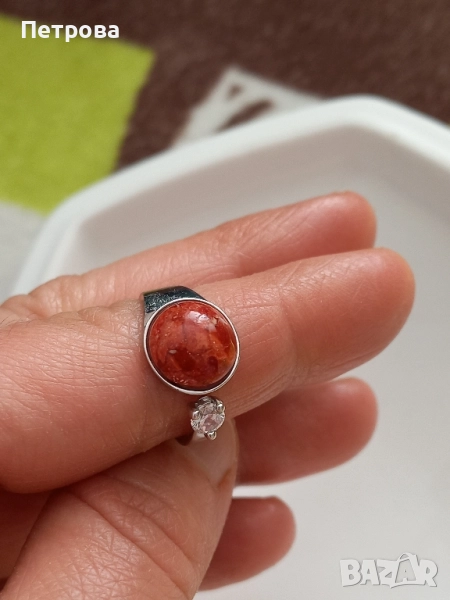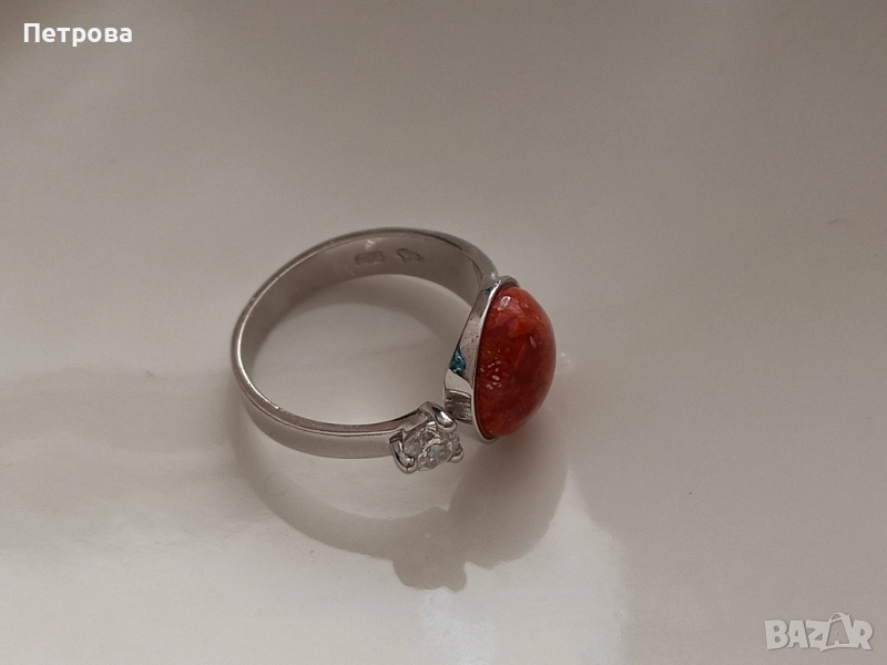 Нов сребърен пръстен с естествен корал и циркон → Обява 52041110