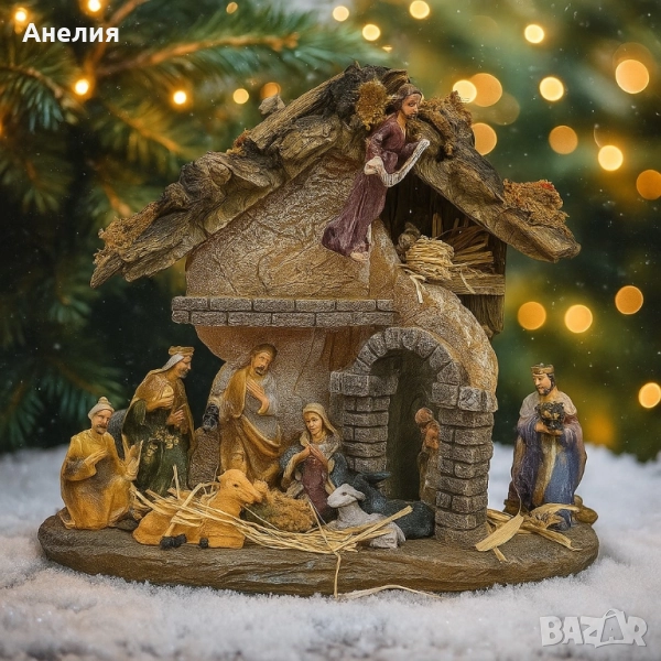 Тип: настолна декоративна сцена „Рождество Христово“ (Коледна ясла/груб); Състав на композицията (видимо от продукта): Светото семейство (Мария и Йосиф), Тримата влъхви, пастир, ангел, животни (вол/овца/магаре), яслa и обор с арка и покрив със сламени детайли; Изпълнение: готова фиксирана композиция върху стабилна овална основа; Предназначение: вътрешна декоративна употреба – дом, офис, витрина, рецепция; Поддръжка: забърсване с мека суха кърпа; избягвайте намокряне и директни ударни натоварвания; Опаковка: кутия – подходяща за съхранение между сезоните и за подарък.