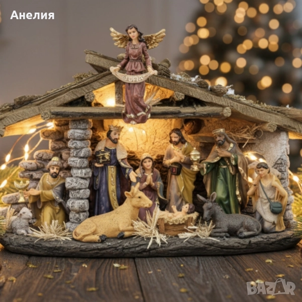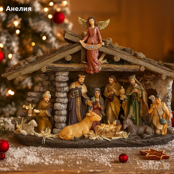 Рождество“ (ясла с фигури); Състав на сцената: Ангел с надпис „GLORIA“ („Слава“), Св. Семейство, трима влъхви, пастир, вол, магаре, овца; Материал: Полирезин (смола), ръчно оцветен; Конструкция: Всички елементи са върху обща, стабилна основа; Предназначение: Интериорна декорация – дома, офис, витрина, рецепция; Поддръжка: Забърсване със суха, мека кърпа; да не се излага на постоянна влага.