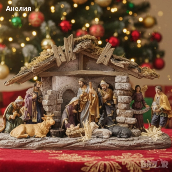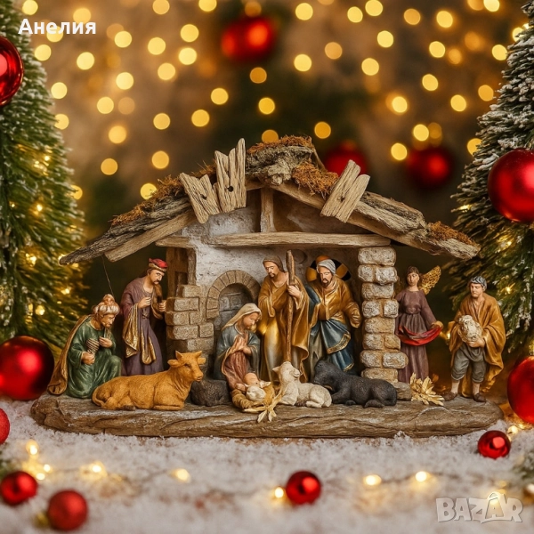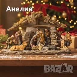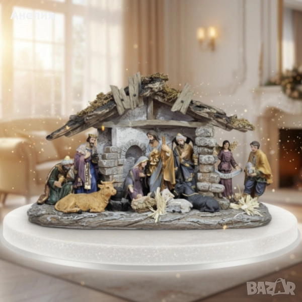 ясли и фигурки; Състав: Тяло/фигурки от полирезин (смола) с ръчно оцветяване; навес с текстура на дърво и камък; декоративни елементи („слама“, каменни колони); Елементи в сцената: Светото семейство, влъхви, пастири, ангел с лента „Gloria“, овце/вол/магаре и други дребни детайли – общо над 10 части в композицията; Монтаж и поддръжка: Готова за използване; поставя се върху равна повърхност; почистване с мека суха кърпа; Приложение: Интериорна декорация – дом, офис, рецепция, витрина, училище/детска стая за разказване на коледната история; Размер: Среден, подходящ за рафт/комод/TV секция (компактен отпечатък; не изисква допълнителен монтаж); Опаковка: Твърда кутия – удобно съхранение след сезона; подходяща за подарък.