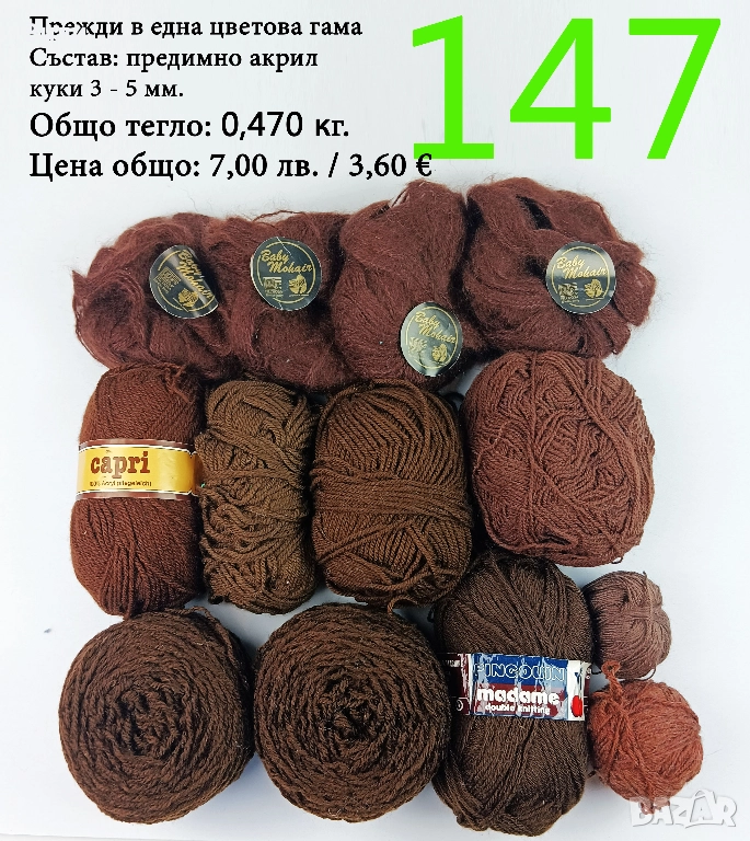 Предлагам прежди в малки количества, като някои от тях са нови, а други са втора употреба. Описанието и цената са посочени на всяка снимка.