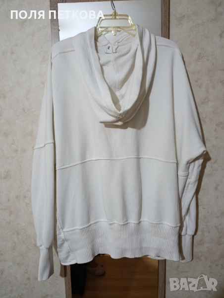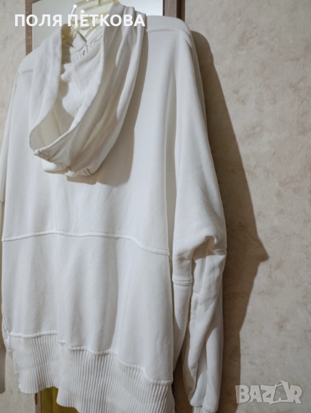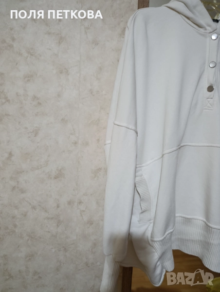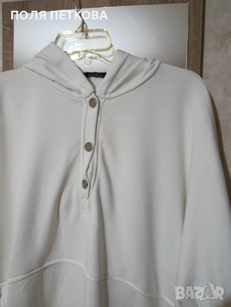 Бяла блуза изчистена широк свободен модел с три тик-так копчета отпред с качулка памучна материя с еластан става за размер 2xl до 4xl гръдна до 160 см талия ханш 150 см цяла дължина 67 см обличана е един път в перфектно състояние