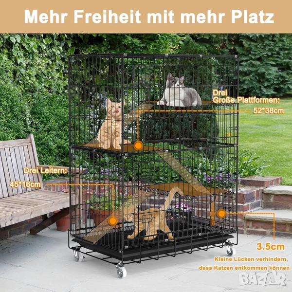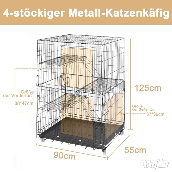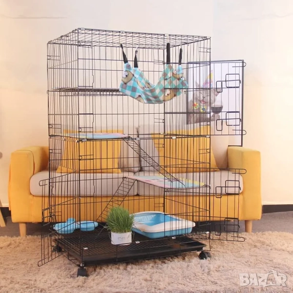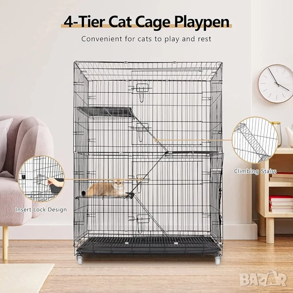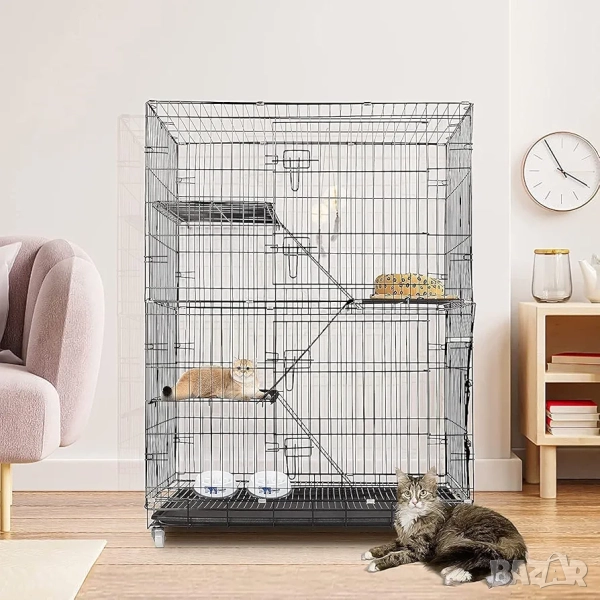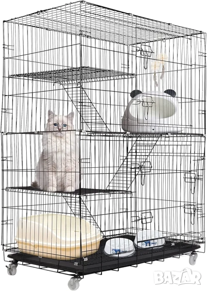 Тази четириетажна метална клетка (кошара) за котки от марката ybaymy предлага сигурна и просторна среда за домашни любимци. Продуктът е проектиран да осигури безопасност и комфорт, като същевременно предоставя достатъчно пространство за движение, игра и почивка. Конструкцията е подходяща както за употреба в закрити помещения, така и на открито, благодарение на устойчивите материали. Сгъваемият дизайн улеснява транспортирането и съхранението, когато клетката не е в употреба.