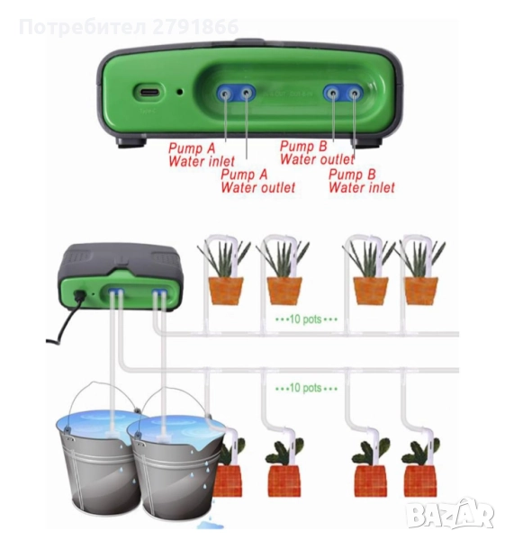 3. ЗАХРАНВАНЕ НА ДВОЙНА ПОМПА: Един комплект може да полее 20 саксии с цветя. Двойните помпи могат да се настройват отделно и независимо за време. (Комплектът включва поливане само на 20 саксии)