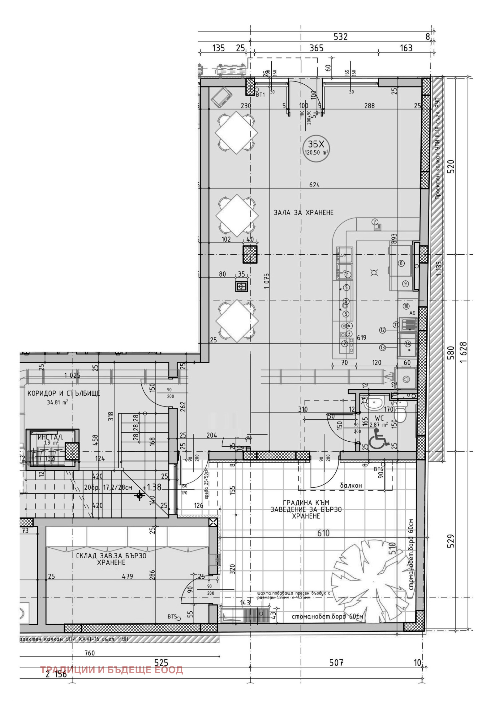 Заведението има изградена вентилационна система за приготвяне на храна, три точки за мивка и височина до окачения таван 2.70 м.