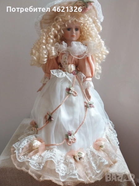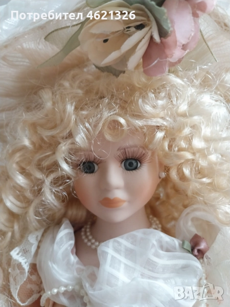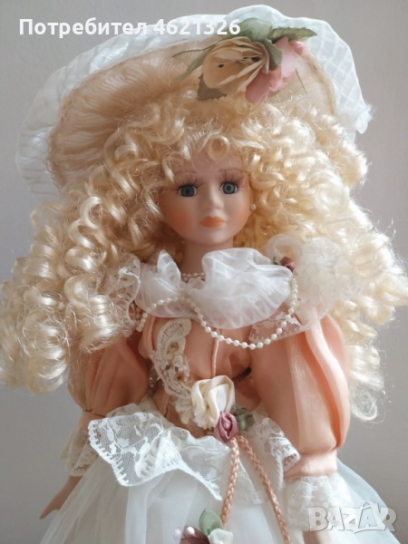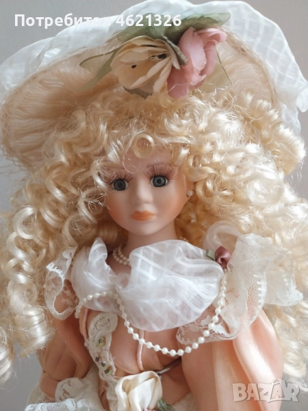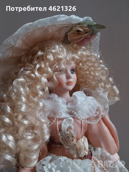 дизайн с тази изящна френска порцеланова кукла. Тя отразява елег в викториански стил, украсена с дантела, сатен иминиатюрни апликации от рози. Роклятае подсилена с обръч. Дългите ѝ златисти къдрици и деликатно изрисуваното лице излъчват вечен чар, напомняйки за красотата на отминала епоха.