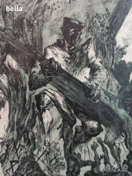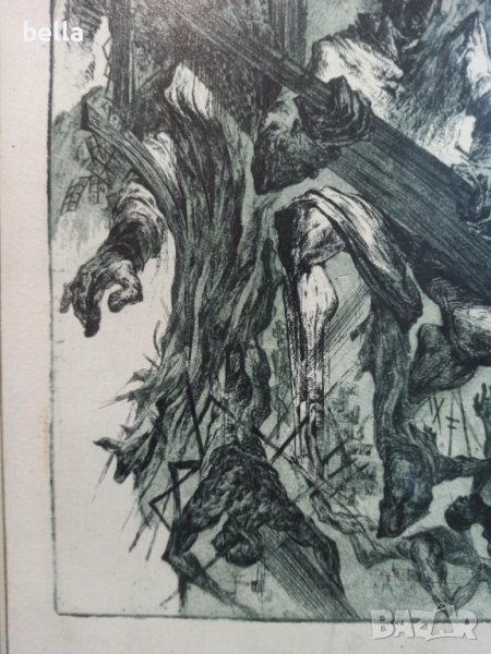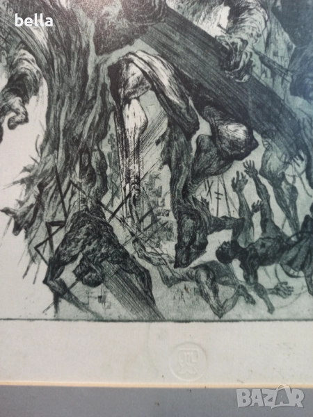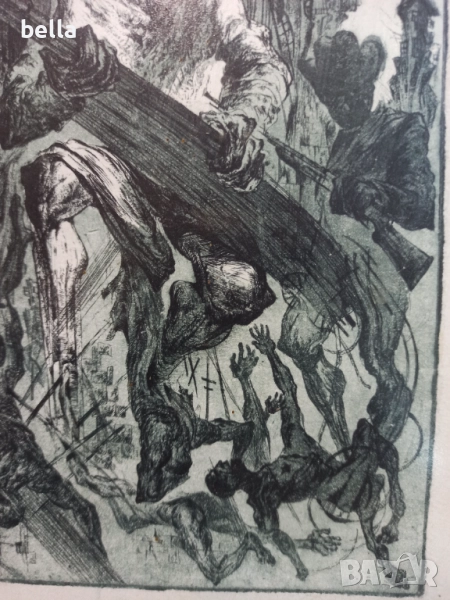 Оригинален офорт / акватинта,графика около 1960–1980 г.Тема: Военна сцена / битка / човешка драма.Техника: офорт, акватинта, суха игла.Подпис: сух релефен печат с инициали „ЕХ“ (авторски знак)