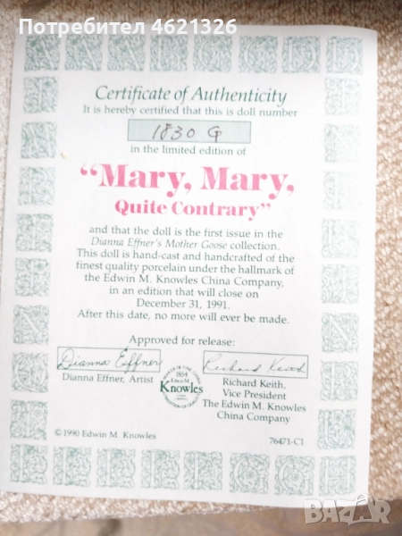 Винтидж порцеланова кукла "Мери, Мери, съвсем противоположна" по Диана Ефнър – рядка находка