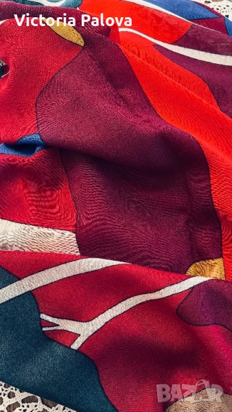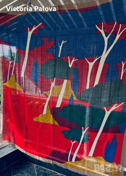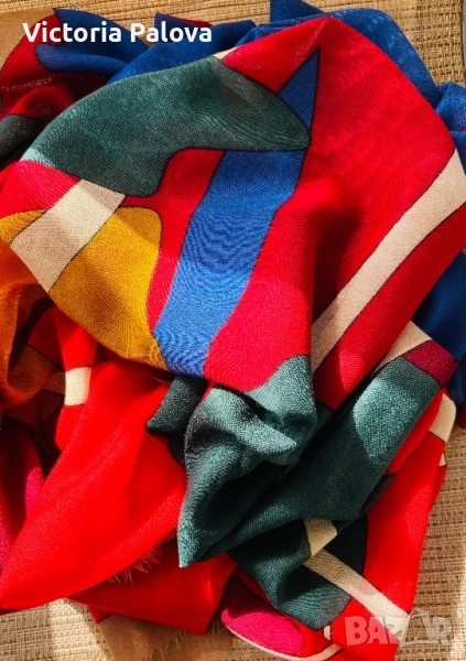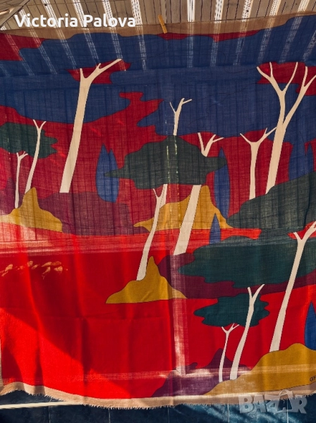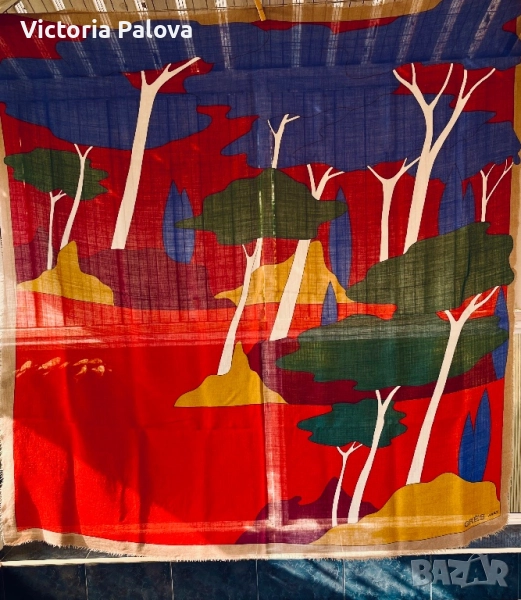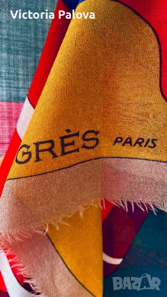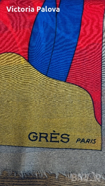 Изключително рядък шал от френската модна къща GRÈS PARIS, име, стоящо зад едни от най- елегантните произведения на висшата мода от 20 век. Изработен от фина тънка вълна, с артистичен и наситен принт в стилен микс от червено, синьо и горчица. Мек, топъл и лек, този шал носи духа на винтидж Париж - неподправен лукс и изтънченост, които днес почти не се срещат.Истинска находка за колекционери и ценители на редки аксесоари. Отлично състояние, подписан в ъгъла, размер : 134см на 134см.