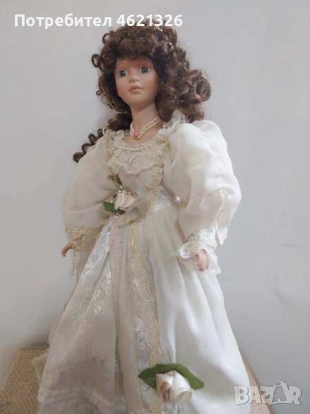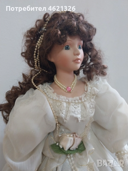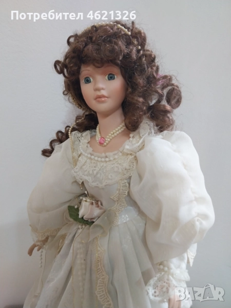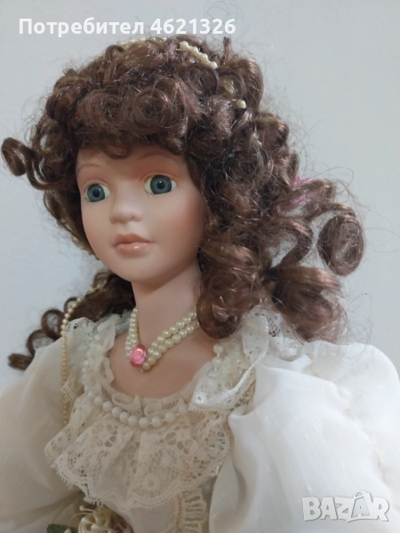 Винтидж висока порцеланова кукла от 80-те и 90-те години на миналия век в пищна светла рокля. Роклята е богато украсена с дантела, цветя, панделки и мъниста. Дълга къдрава кафява коса, сини очи. Куклата има бижута около врата и в косата.