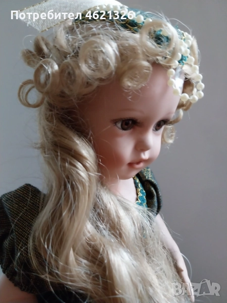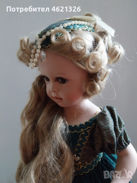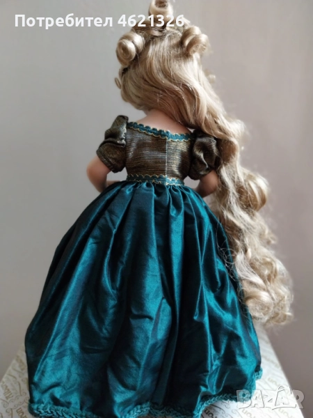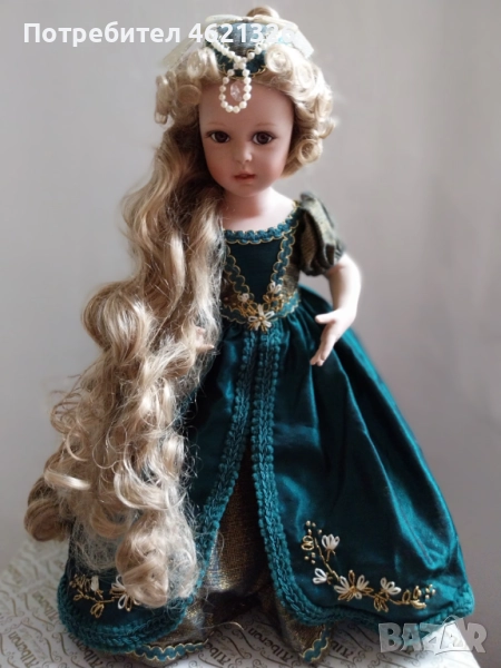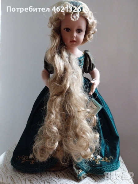 Изживейте очарованието на класическата приказка с куклата Рапунцел. Тази порцеланова фигурка улавя същността на любимия герой, допълнена със сложни детайли и вечен чар, който надхвърля поколенията. Отворените кафяви очи на куклата добавят завладяващ щрих, съживявайки спокойното изражение на Рапунцел. Куклата е с дължина 18 инча (45 см) и има руса, вълниста коса. Облечена е в разкошна, зелена рокля със сложни детайли.