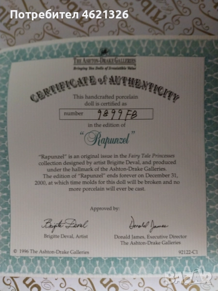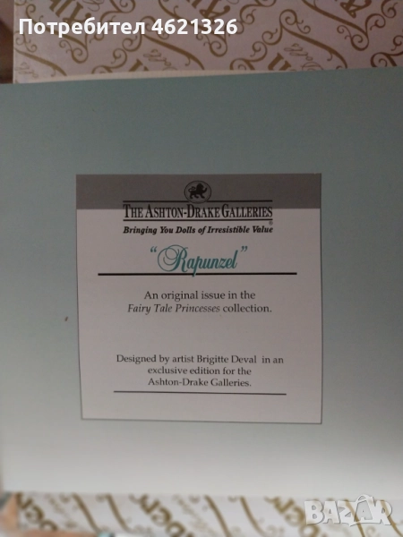 Представям ви винтидж порцеланова кукла Рапунцел от галериите Аштън Дрейк, произведена през 1996 г. Идеята е на художничката Бриджит Дювал и е произведена в САЩ.