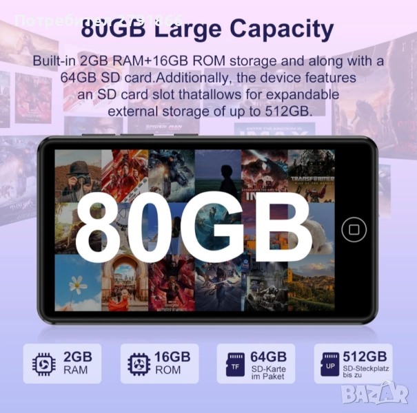 - 80 GB голям капацитет: нашият детски MP3 плейър е оборудван с 2 GB RAM и 80 GB памет (16 GB ROM + 64 GB TF карта), поддържа разширяване на външна памет до 1 TB, което лесно може да побере хиляди музикални произведения, отговаряйки на нуждата ви от съхранение на повече песни, видеоклипове, аудиокниги.